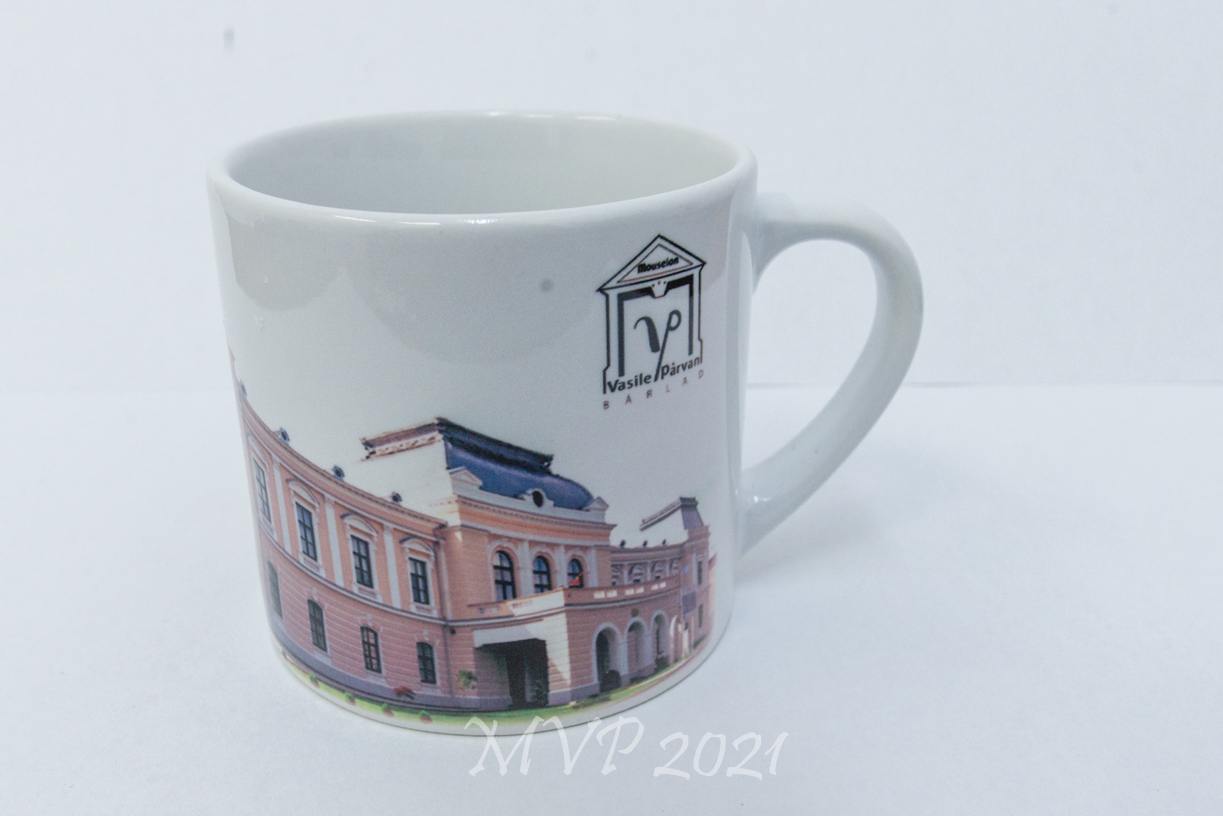 Cu imaginea Muzeului „Vasile Pârvan”, „Nicolae Tonitza”, „Alexandru Ioan – Cuza” – dimensiuni: h 7 cm, diametru 9 cm, cu imagini full color, în cutii carton kraft, etichetate cu modelul cănii și producător